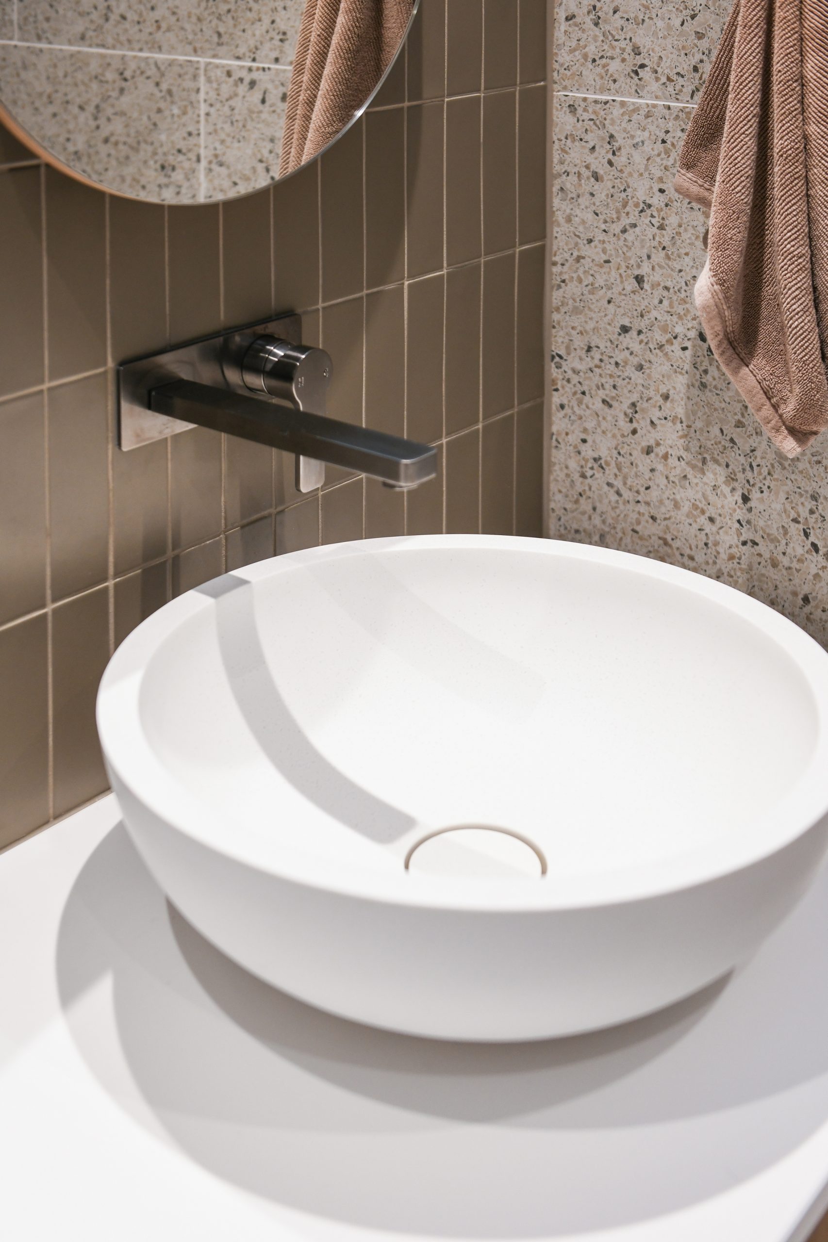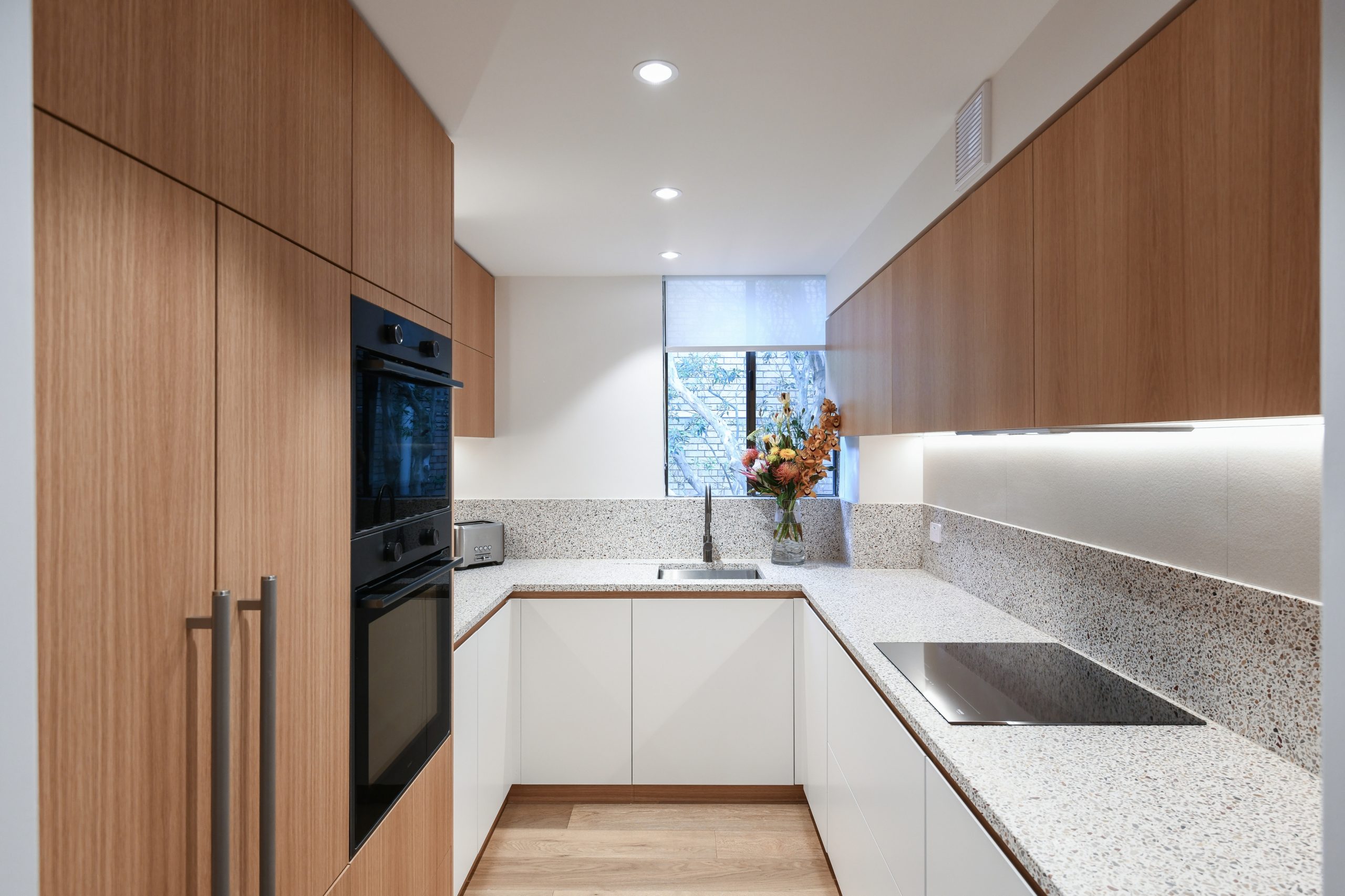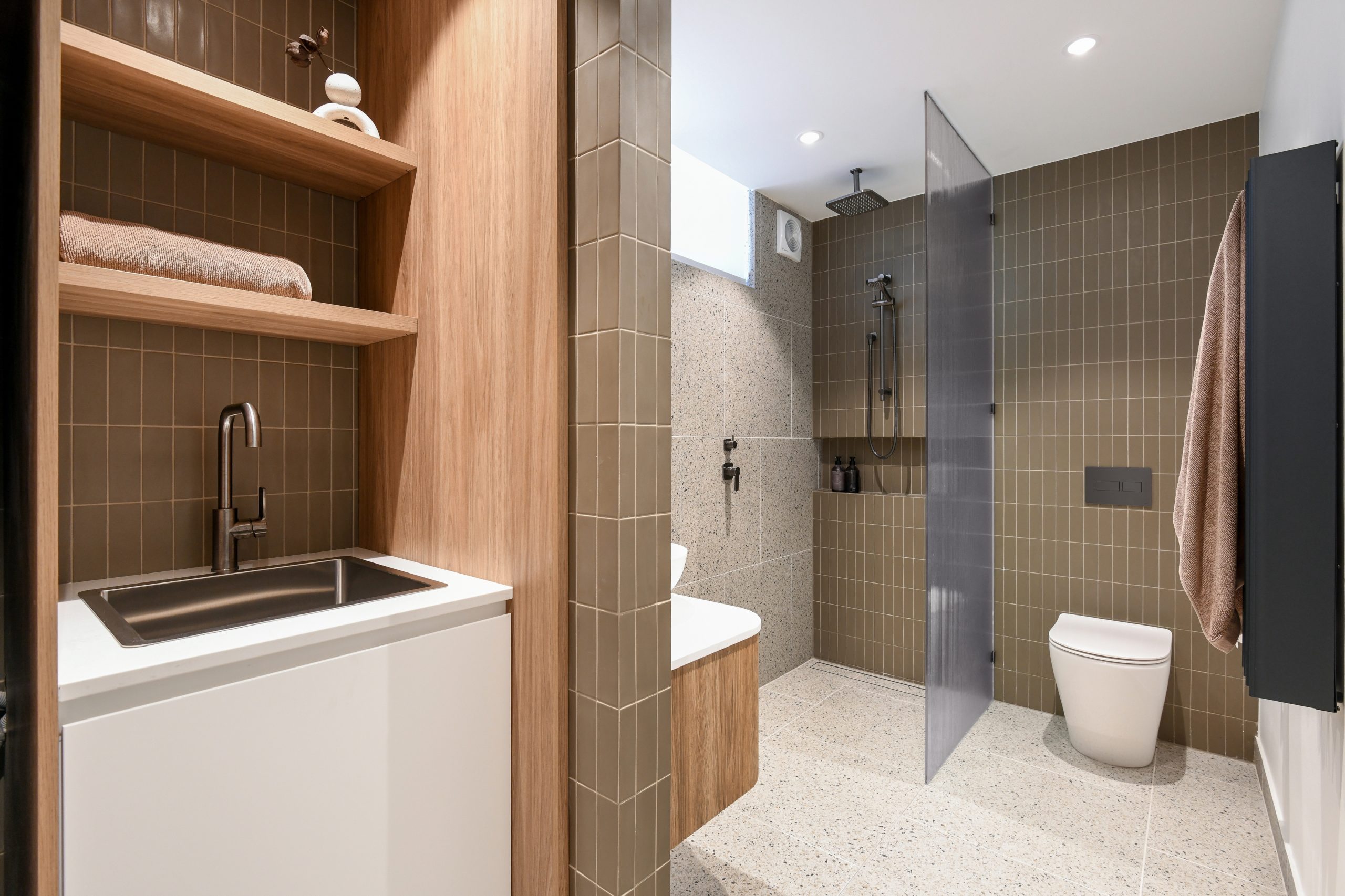 The Warm Minimalist design direction prioritizes texture and calm. Key materials include multi-toned terrazzo across benchtops and walls, juxtaposed with rhythmic, vertical fluted tiling in soft neutrals for depth. This is anchored by extensive use of natural timber veneer joinery for cabinetry and the staircase, which introduces essential organic warmth. Paired with a sophisticated palette and sleek gunmetal fixtures, the result is a beautifully balanced, highly functional home, defining modern Sydney townhouse interiors.