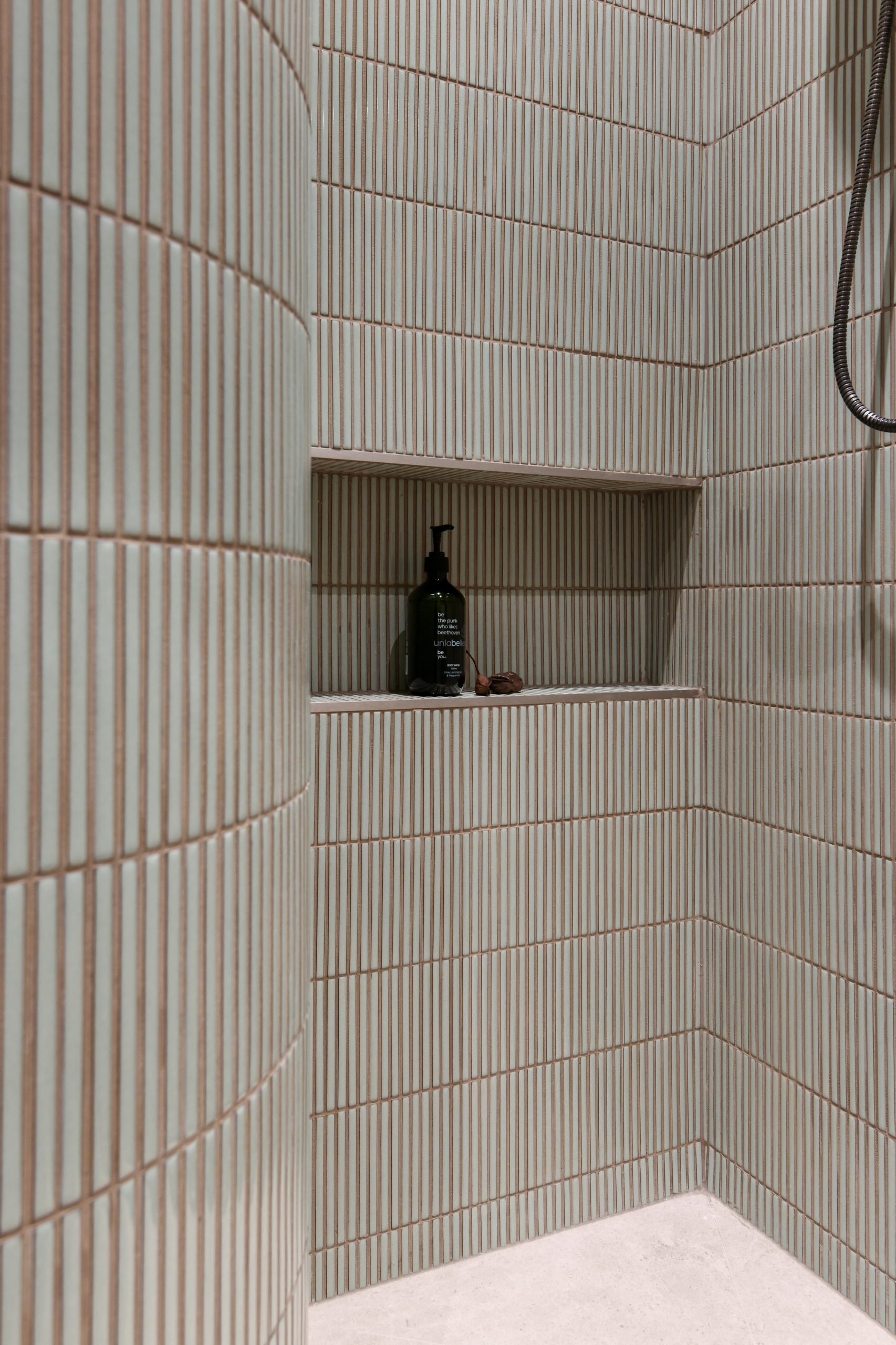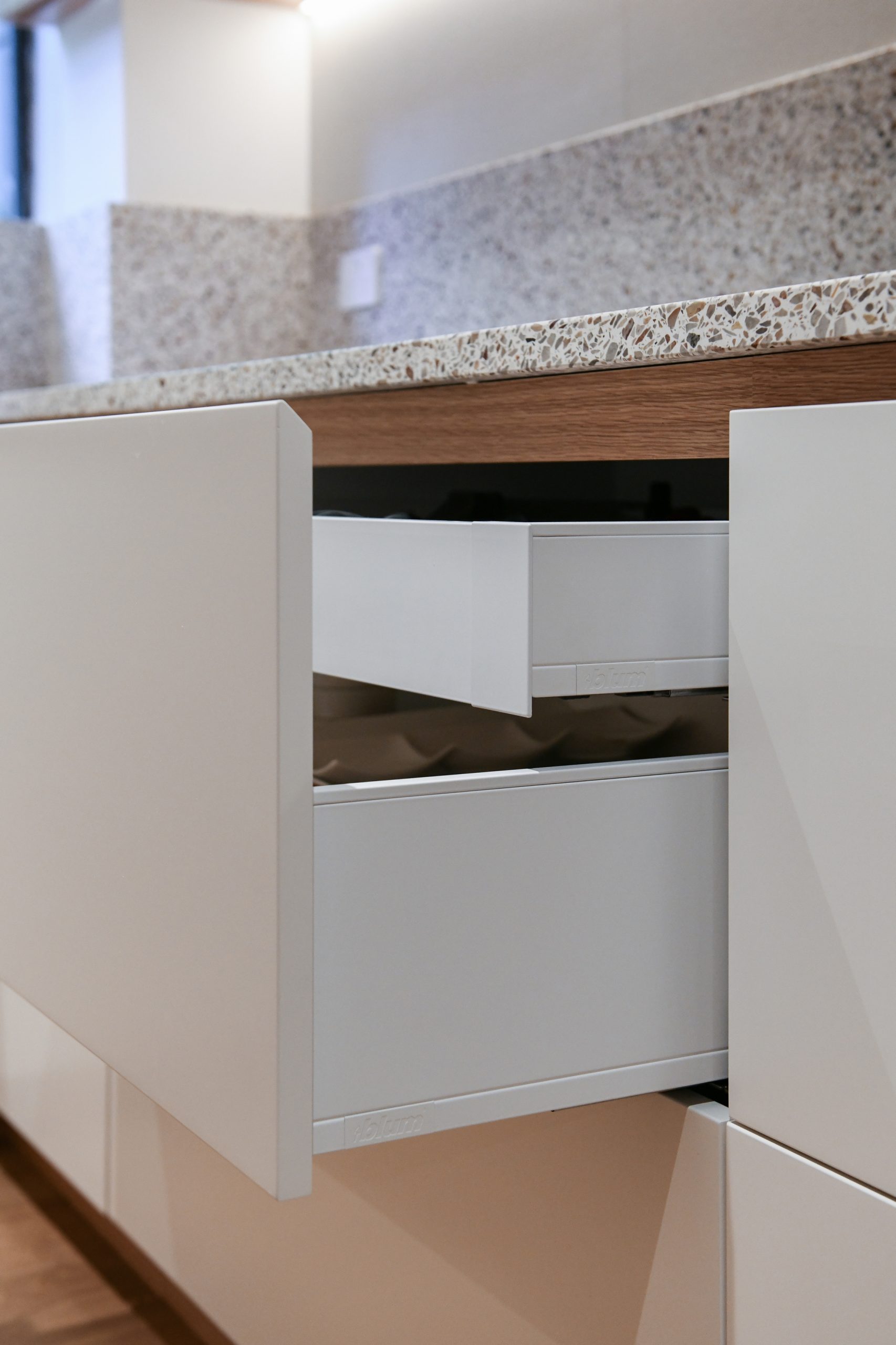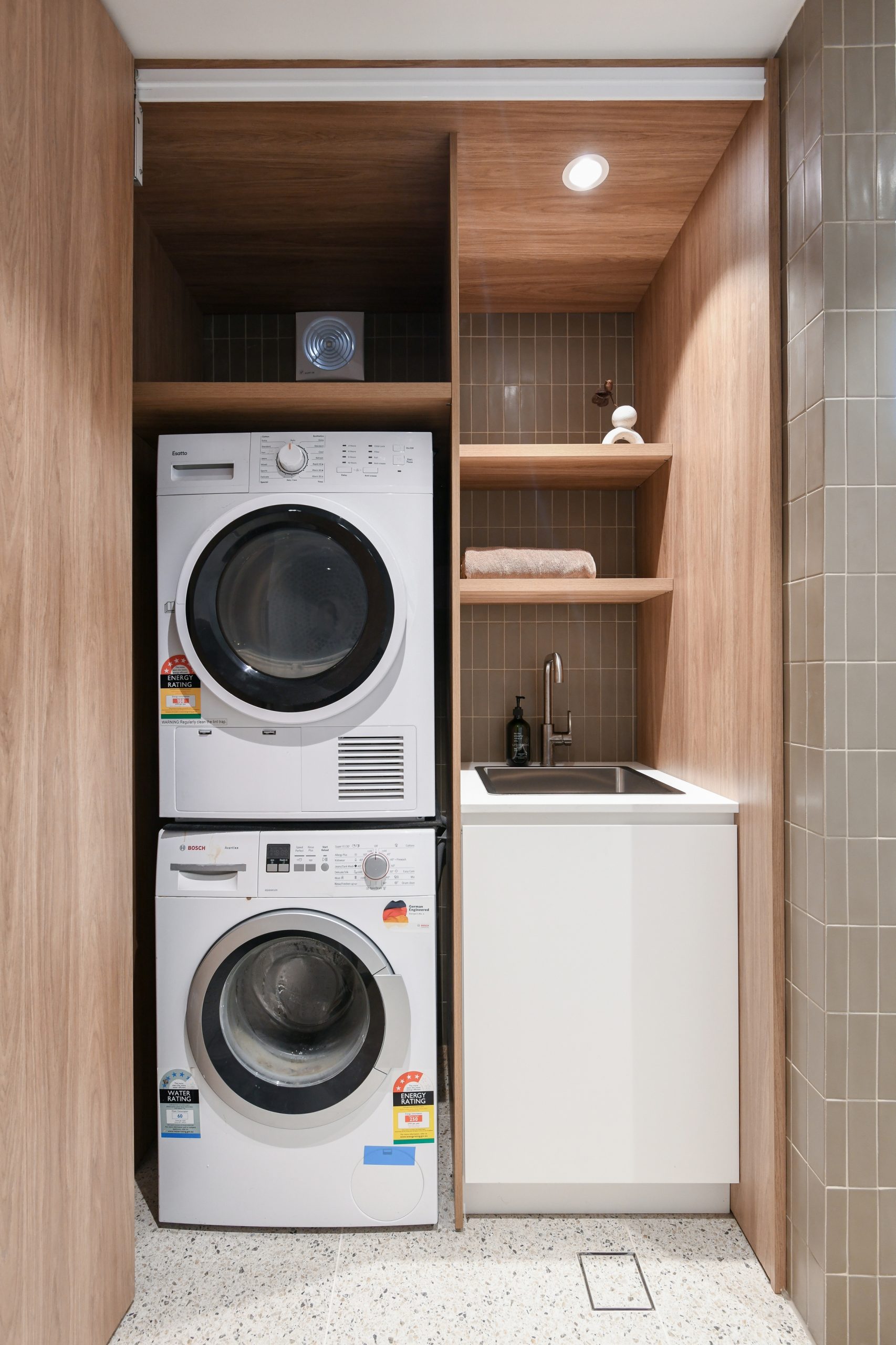 The Warm Minimalist design direction prioritizes texture and calm. Key materials include multi-toned terrazzo across benchtops and walls, juxtaposed with rhythmic, vertical fluted tiling in soft neutrals for depth. This is anchored by extensive use of natural timber veneer joinery for cabinetry and the staircase, which introduces essential organic warmth. Paired with a sophisticated palette and sleek gunmetal fixtures, the result is a beautifully balanced, highly functional home, defining modern Sydney townhouse interiors.