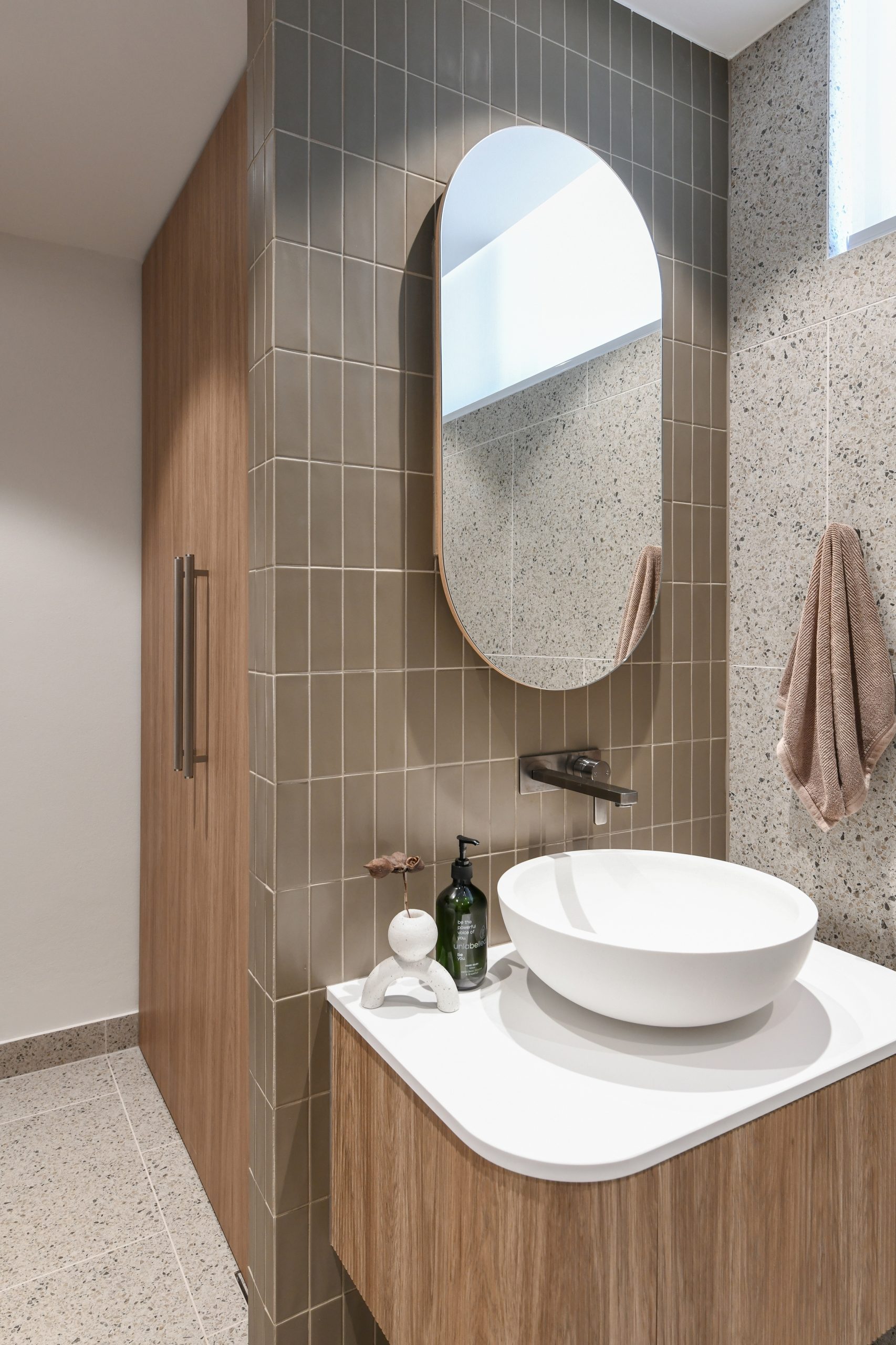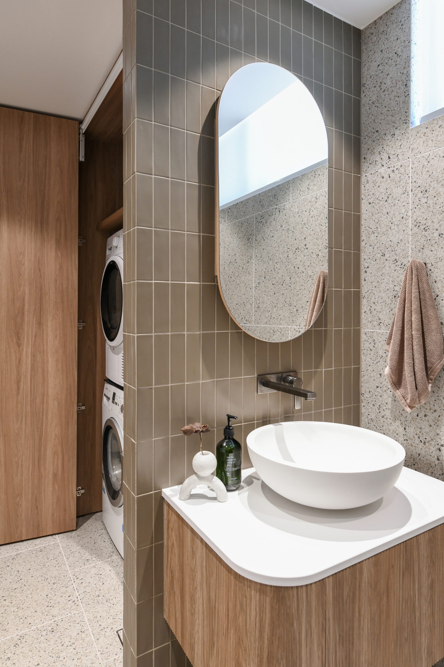 Warm Minimalist design: Terrazzo, timber, and fluted tiles create serene, functional Sydney townhouse interior.