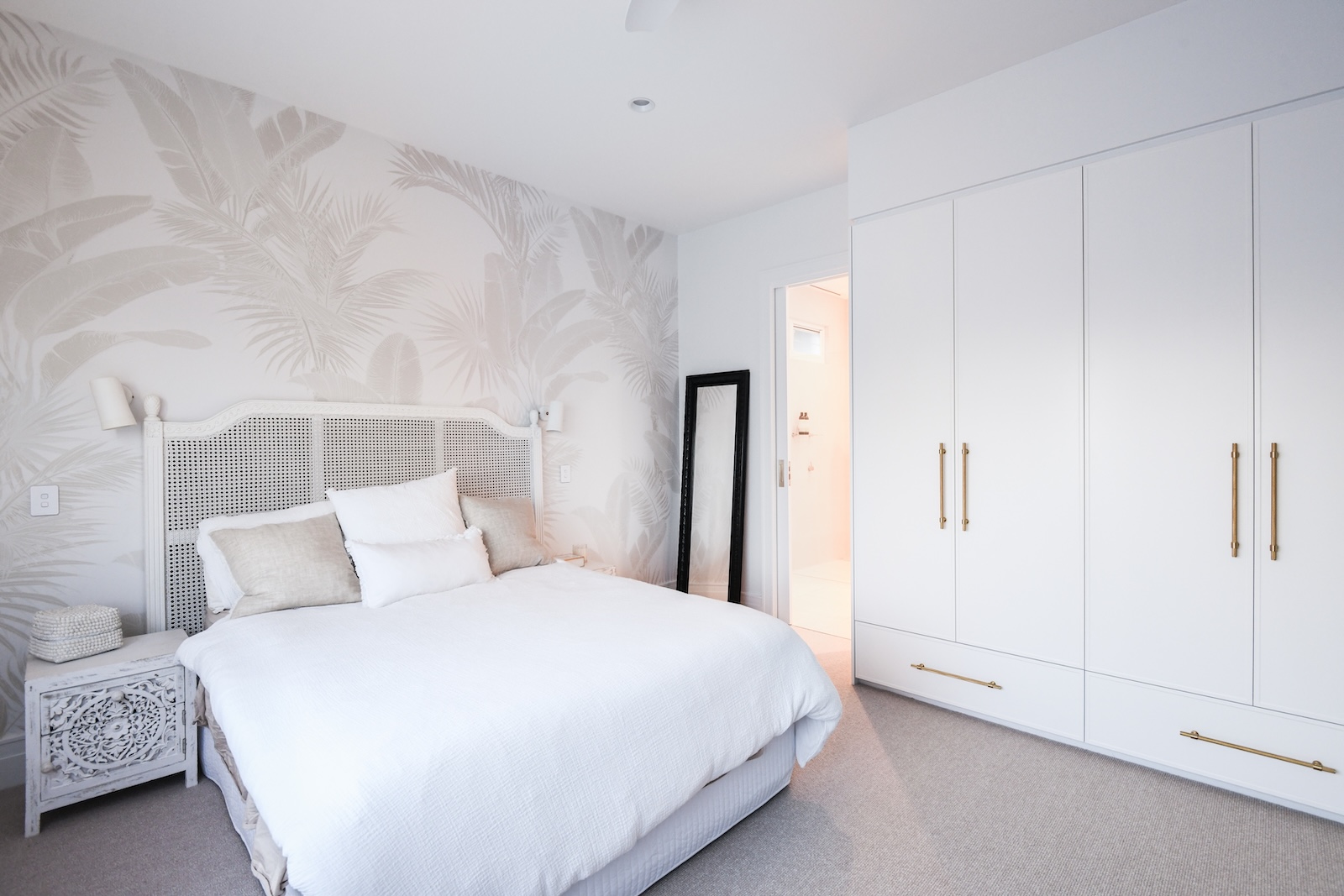 This commitment to bespoke design continues in the private quarters. The primary suite was transformed into a serene retreat, featuring a spa-like ensuite where a freestanding bathtub is perfectly positioned to capture stunning ocean views. A custom floating vanity with detailed fluted timber drawer fronts and brushed brass fixtures adds a layer of tactile luxury. The new layout also accommodates a spacious walk-in robe with custom cabinetry, delivering exceptional organisation.